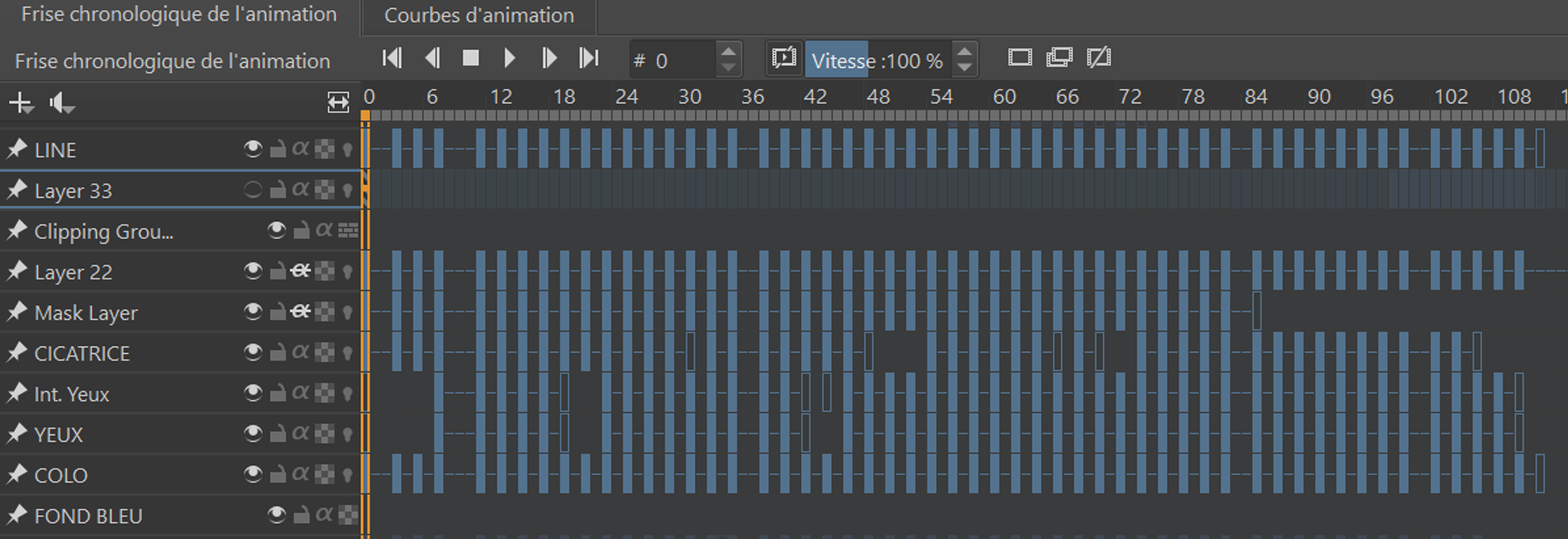 Ci-contre, voici un morceau de la timeline de l’animation en question. Elle est animée à un rythme de 12 images par secondes et est découpée en de multiples calques qui comprennent l’animatique, le line, la colorisation, ainsi que divers éléments comme les lunettes ou la cicatrice, que j’ai ajoutés à l’animation séparément.